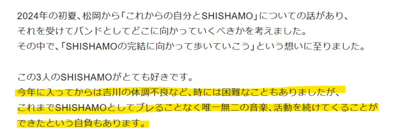 解散を発表したライブでのSHISHAMOのコメントからは、この体調不良が原因と受け取れる言葉は一つもありませんでした。